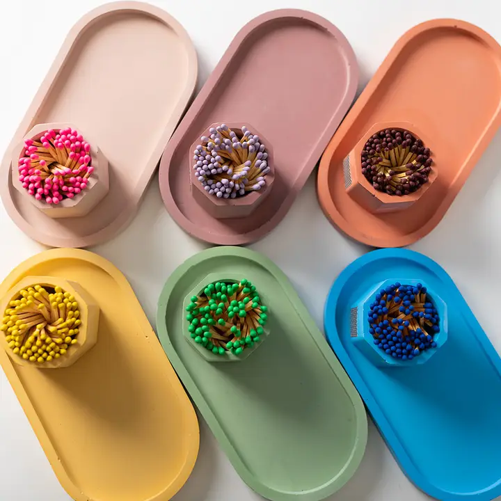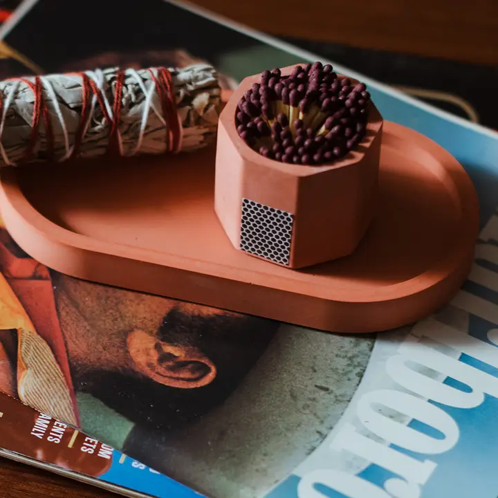Each match stick holder is hand-poured concrete with a cork bottom to protect your surfaces. Each set comes matches included. There is also a striker pad attached to the side of your holder for easy lighting.